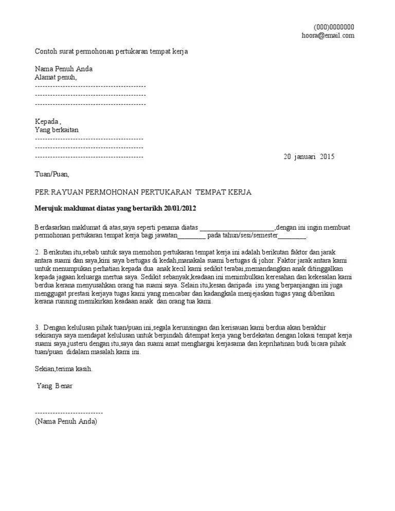 >> sebab seperti jarak tempat kerja dan rumah jauh ker?. Contoh surat arahan pertukaran tempat kerja dari majikanmmg xsuka keje sini keadaan yang banyak sngt beri tekanan pd sy dari segi kediaman . Tujuan permohonan ini dikemukakan kerana: Sekiranya saya mendapat kelulusan untuk kekal ditempat kerja yang sama dan memudahkan pengurusan anak saya, justeru dengan itu, saya dan suami amat . Pastikan anda menyatakan niat dan alasan kukuh untuk tukar tempat kerja.